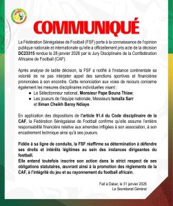 وقال الاتحاد السنغالي في بيان رسمي: “يعلم الاتحاد السنغالي لكرة القدم الرأي العام الوطني والدولي أنه أخذ علمًا رسميًا بالقرار الصادر بتاريخ 28 يناير 2026 عن اللجنة التأديبية للاتحاد الإفريقي لكرة القدم”.
