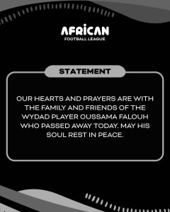 ونشرت الصفحة الرسمية للمسابقة الإفريقية الجديدة، تعزية عبر حسابتها الرسمية بمواقع التواصل الاجتماعى، جاء فيها:” قلوبنا وصلواتنامع عائلة وأصدقاء لاعب الوداد أسامة فلوح الذي وافته المنية اليوم. قد ترقد روحه في سلام“.