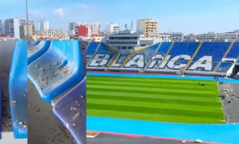 وظهرت الكراسي متسخة، بسبب فضلات الطيور التي تحلق فوق مركب محمد الخامس، إلى جانب وجود أزبال في ممرات المدرجات.
