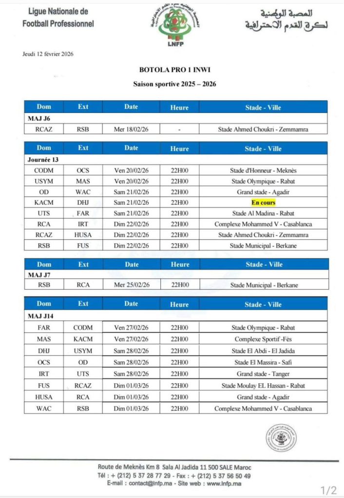 وقررت العصبة الاحترافية تأجيل مباريات الوداد والجيش الملكي، إلى شهر مارس القادم، على أن تكون المباراة الأولى لنهضة بركان أمام نهضة الزمامرة، عن مؤجل الجولة السادسة في الـ18 من شهر فبراير الجاري.