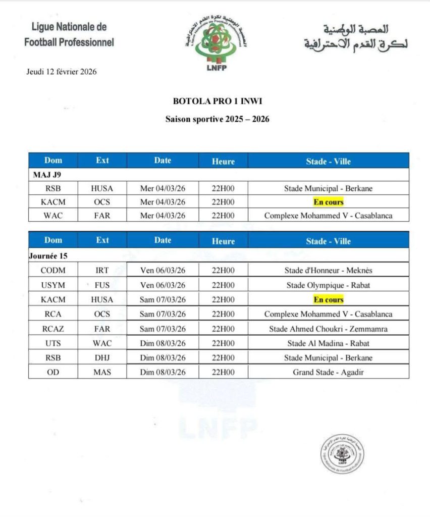 كشفت العصبة الوطنية الاحترافية، عبر لجنة برمجتها، عن برنامج المباريات المؤجلة عن البطولة الوطنية الاحترافية، وأيضا الجولتين الـ14 والـ15.