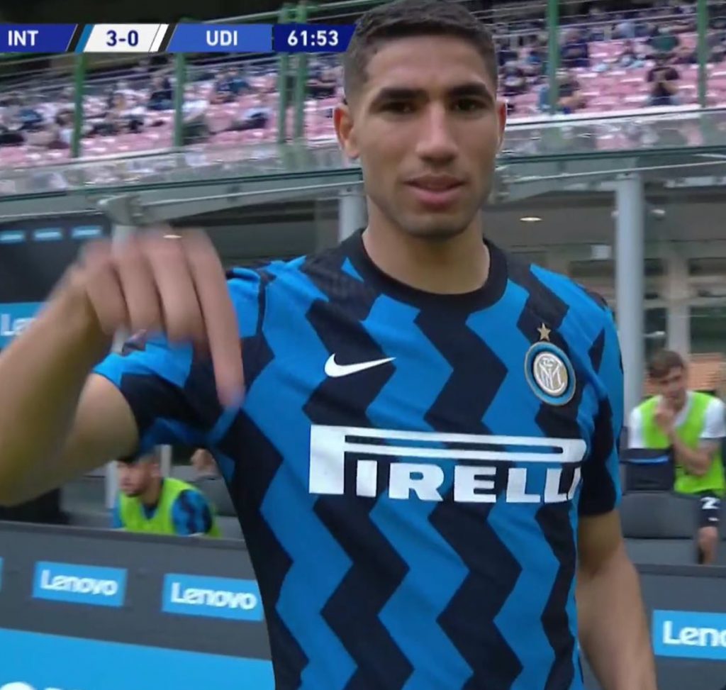 وظهر حكيمي عند توجهه لمقاعد البدلاء عقب تغييره من طرف المدرب، أنتونيو كونتي، يقوم بإشارة لـ”الكاميرا” مخبرا عن طريقها بقاءه مع الفريق عكس ما تم تداوله.