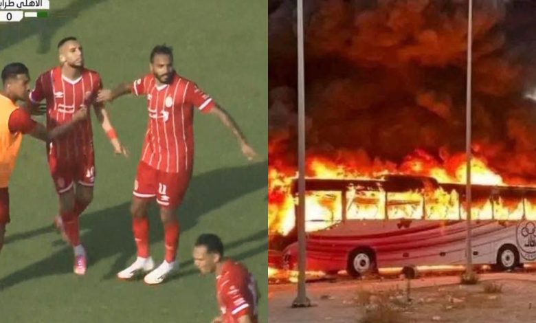 هدف الزرهوني يتسبب في أحداث شغب خطيرة وإضرام للنار في حافلة الاتحاد الليبي- فيديو
