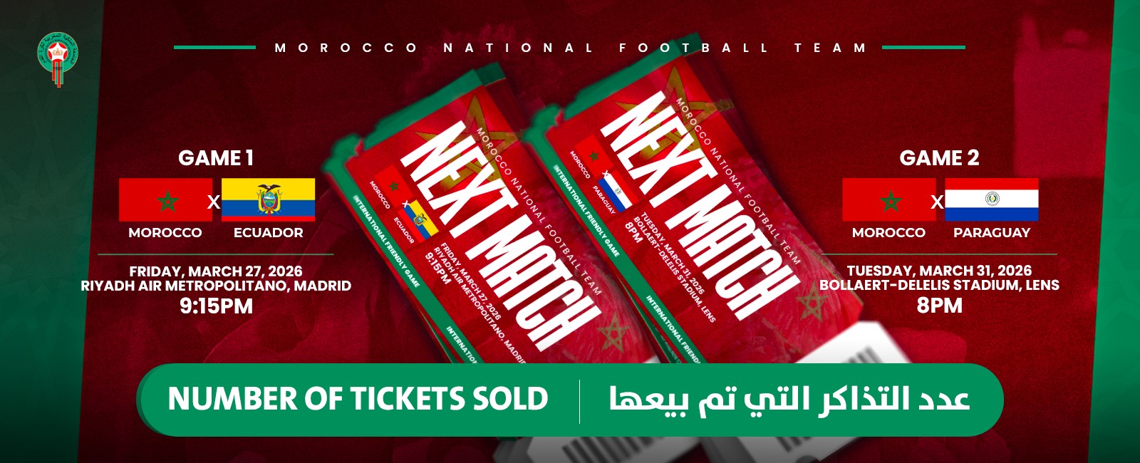 أعلنت اللجنة المنظمة للمباراتين الوديتين اللتين سيخوضهما المنتخب الوطني، أمام منتخب الإكوادور يوم 27 مارس المقبل بمدريد، وأمام منتخب الباراغواي يوم الثلاثاء 31 من ذات الشهر في لانس الفرنسية، عن عدد التذاكر المباعة حتى الآن للمباراتين معًا.